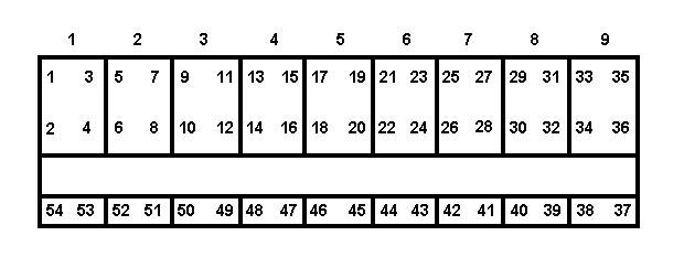 El bagon se separa en 9 compartimentos de 6 plazas cada uno, como se muestra en la imagen. Así, el primer compartimento consta de los siguientes lugares 1, 2, 3, 4, 53 y 54, el segundo compartimento consta de los lugares 5, 6, 7, 8, 51 y 52, y así sucesivamente.